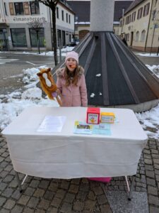 In regelmäßigen Abständen sind wir auf dem Biomarkt in Türkheim und dem Marienplatz in Mindelheim mit einem Stand. Bei gutem Wetter gibt es einen Basteltisch für Kinder, bei schlechtem Wetter nur Infos für die Eltern.